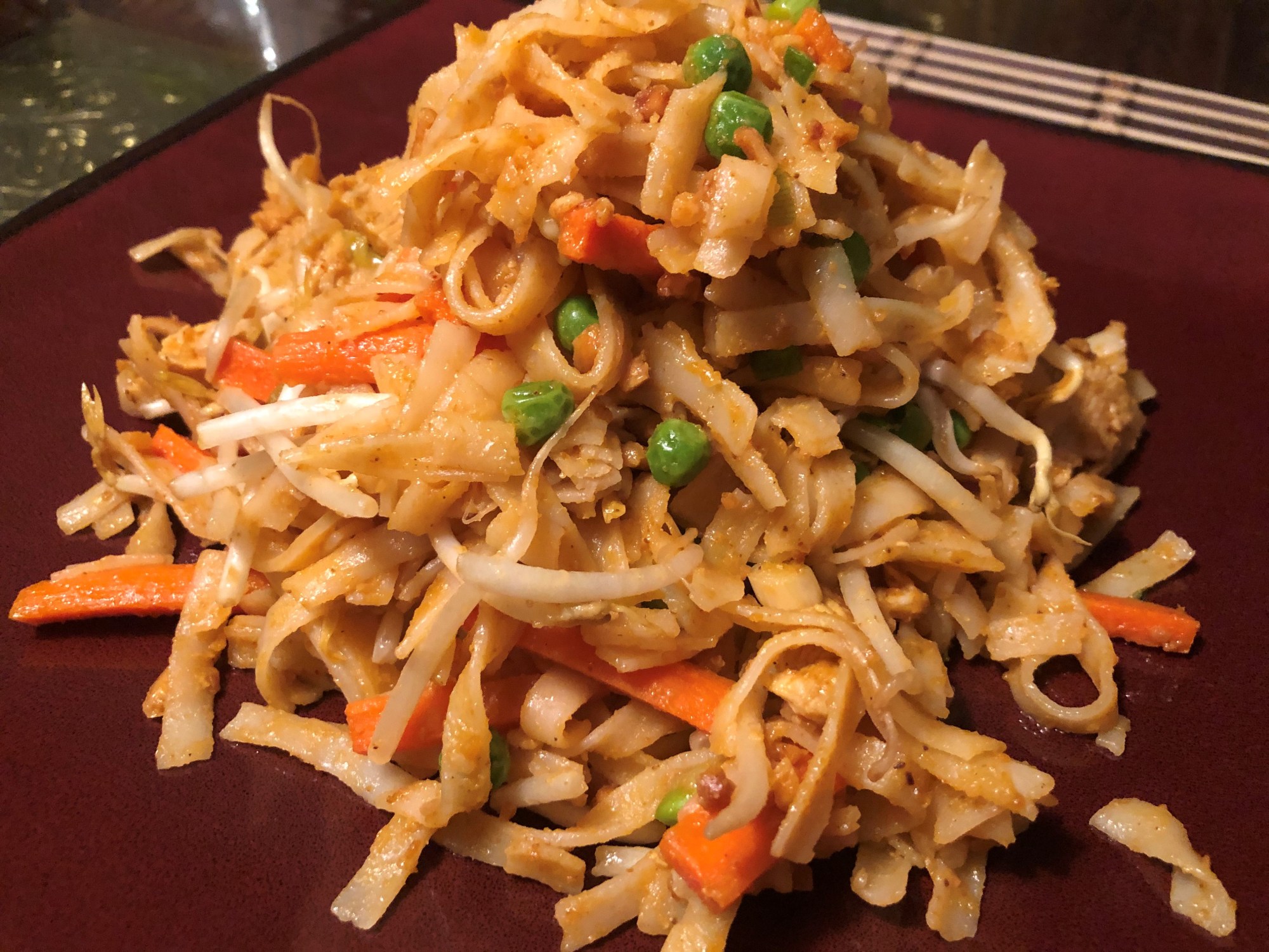 Clean pot, fill with water and bring to a boil. Cook rice noodles for 6-8 minutes (follow package instructions); when cooked al dente drain water. Put noodles back in pot, add chicken and carrot mix and pad thai sauce and mix. If not enough sauce, add a bit more sesame oil.