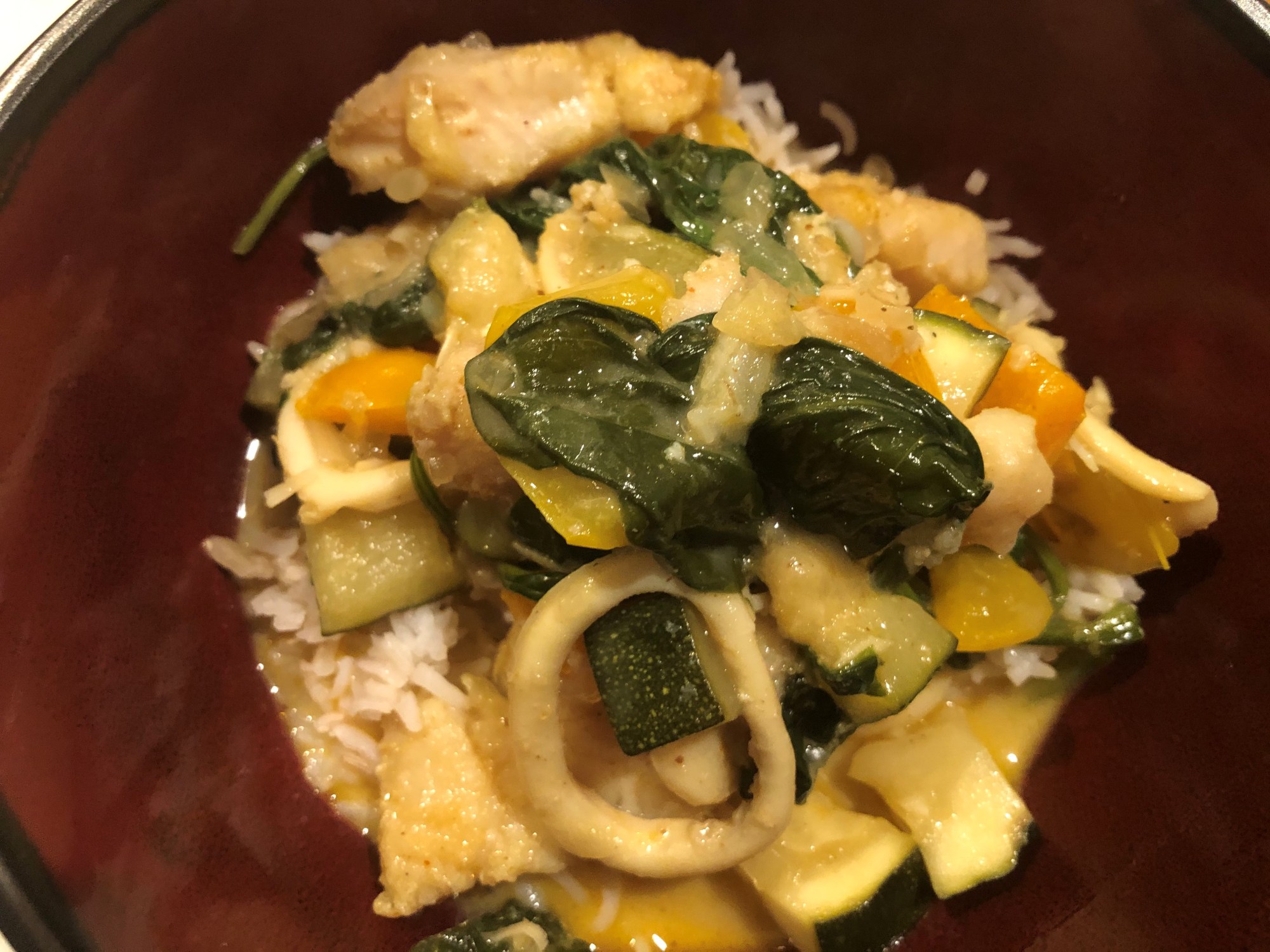 Add fish fillet and squid, close lid and let cook at low-to-medium heat for 4-5 minutes until squid is done. The fish fillet usually cooks very fast. Add shredded coconut if you are using it.