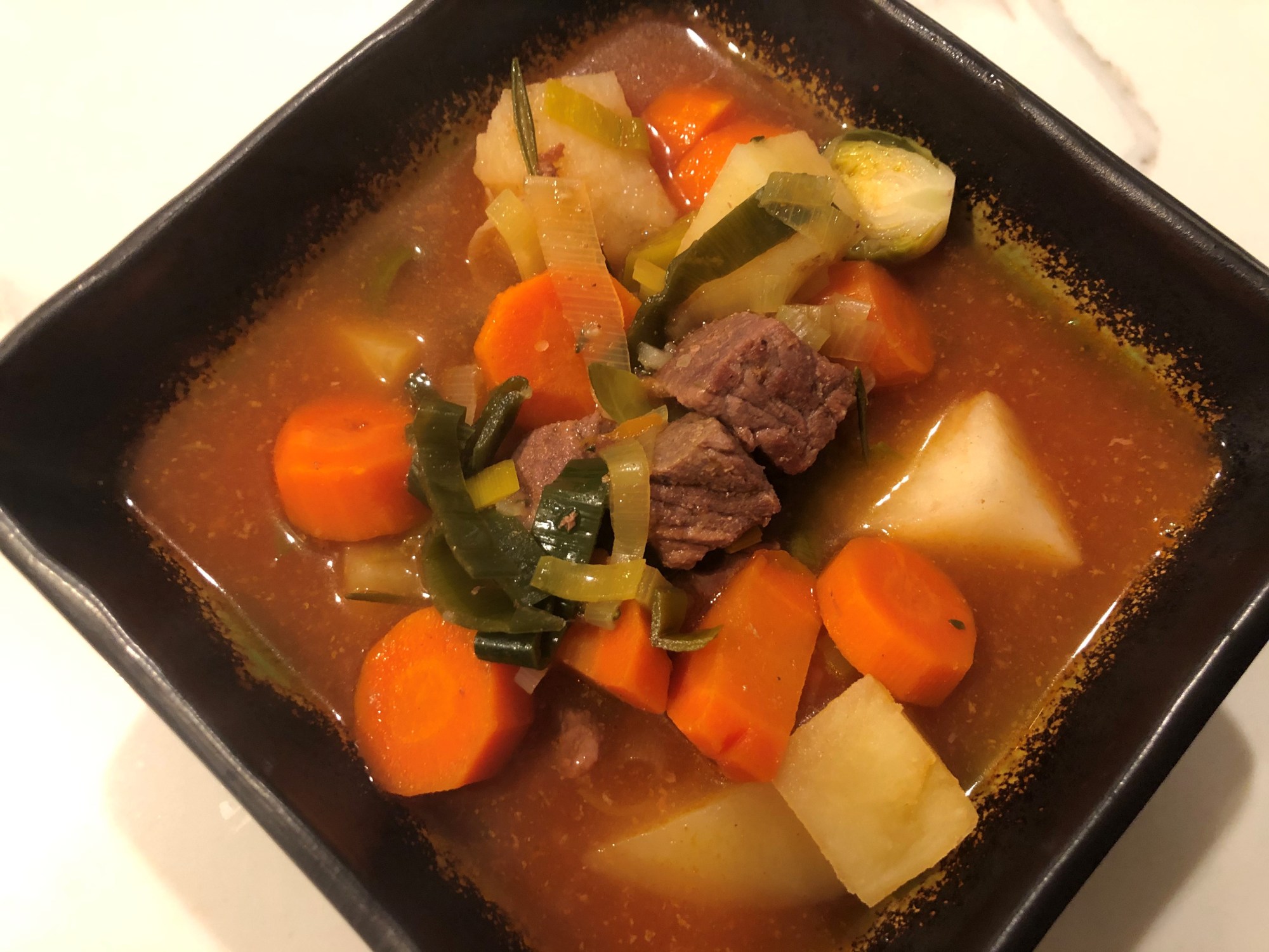 Add carrots, potatoes, leek, paprika, tomato paste, thyme and an additional two cups (500ml) of water and the red wine. Add salt and pepper and some chili if you like to spice it up. Stir carefully, let briefly boil, reduce heat and let simmer at low heat for 30-45 minutes or until the beef is very tender. The longer you cook it, the more tender the met will be, so don’t be shy to let it simmer for 2 hours if you have the time.