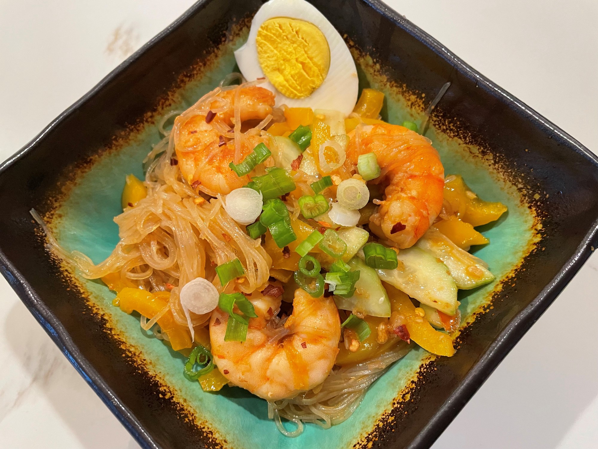Divide noodles among shallow bowls. Top with the shrimp/pepper/cucumber mix and garnish with scallions and eggs.