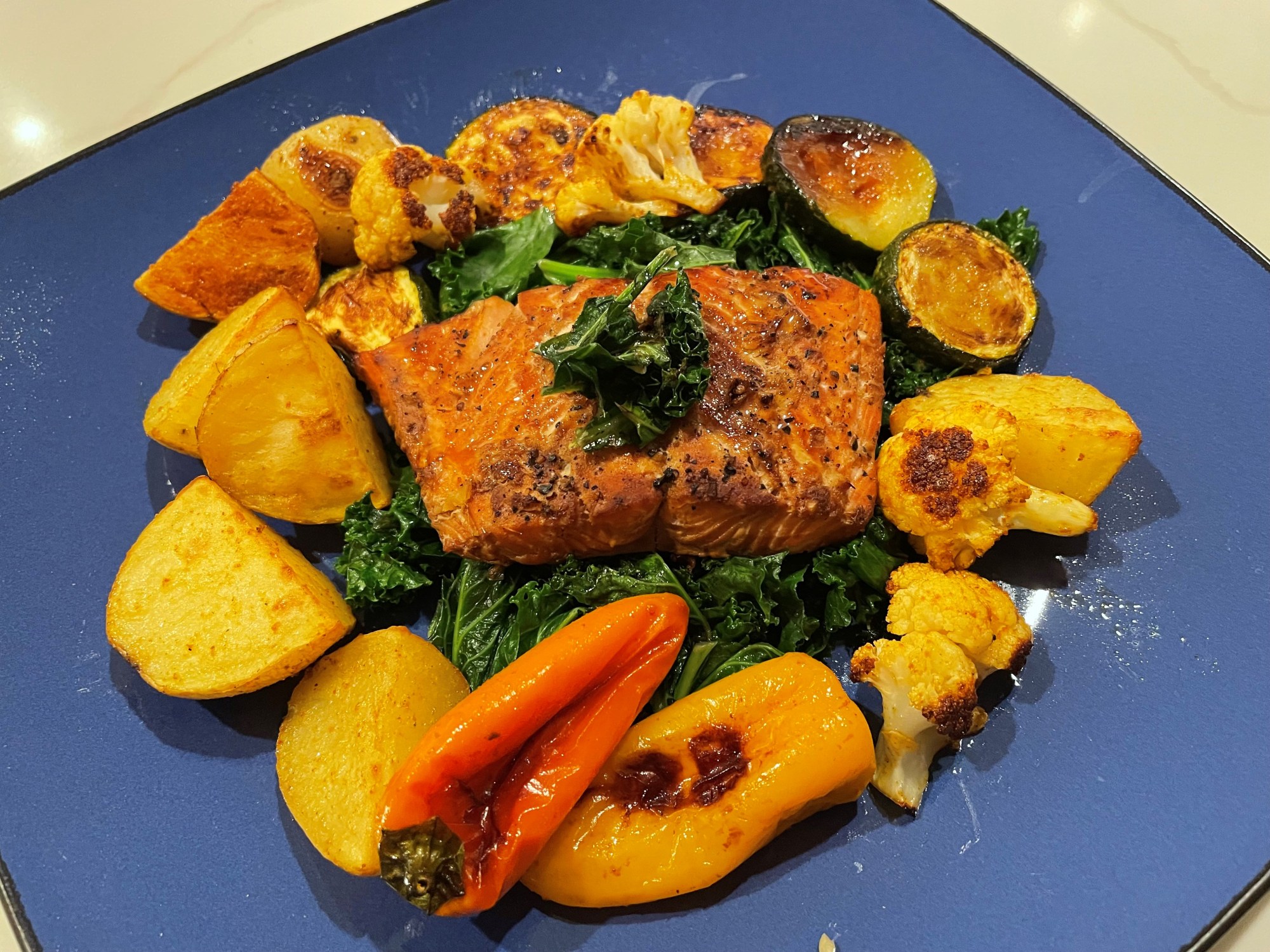 Use a large non-stick oven sheet, put the marinated salmon fillets on the sheet and evenly distribute all of the veggies around the salmon.