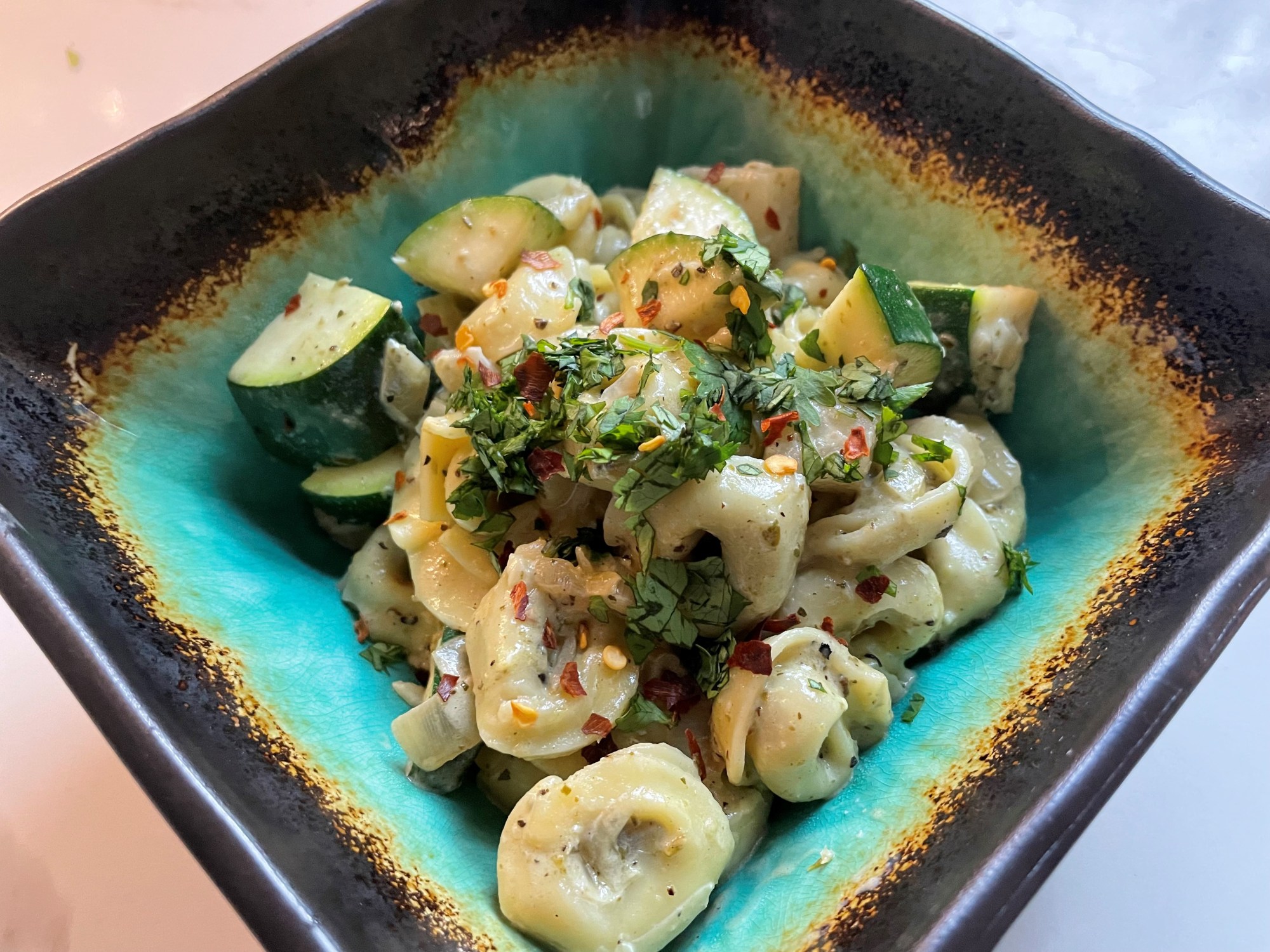 Add zucchini-mushroom mix to the pot with the tortellini and toss carefully mix so the tortellini don’t break.