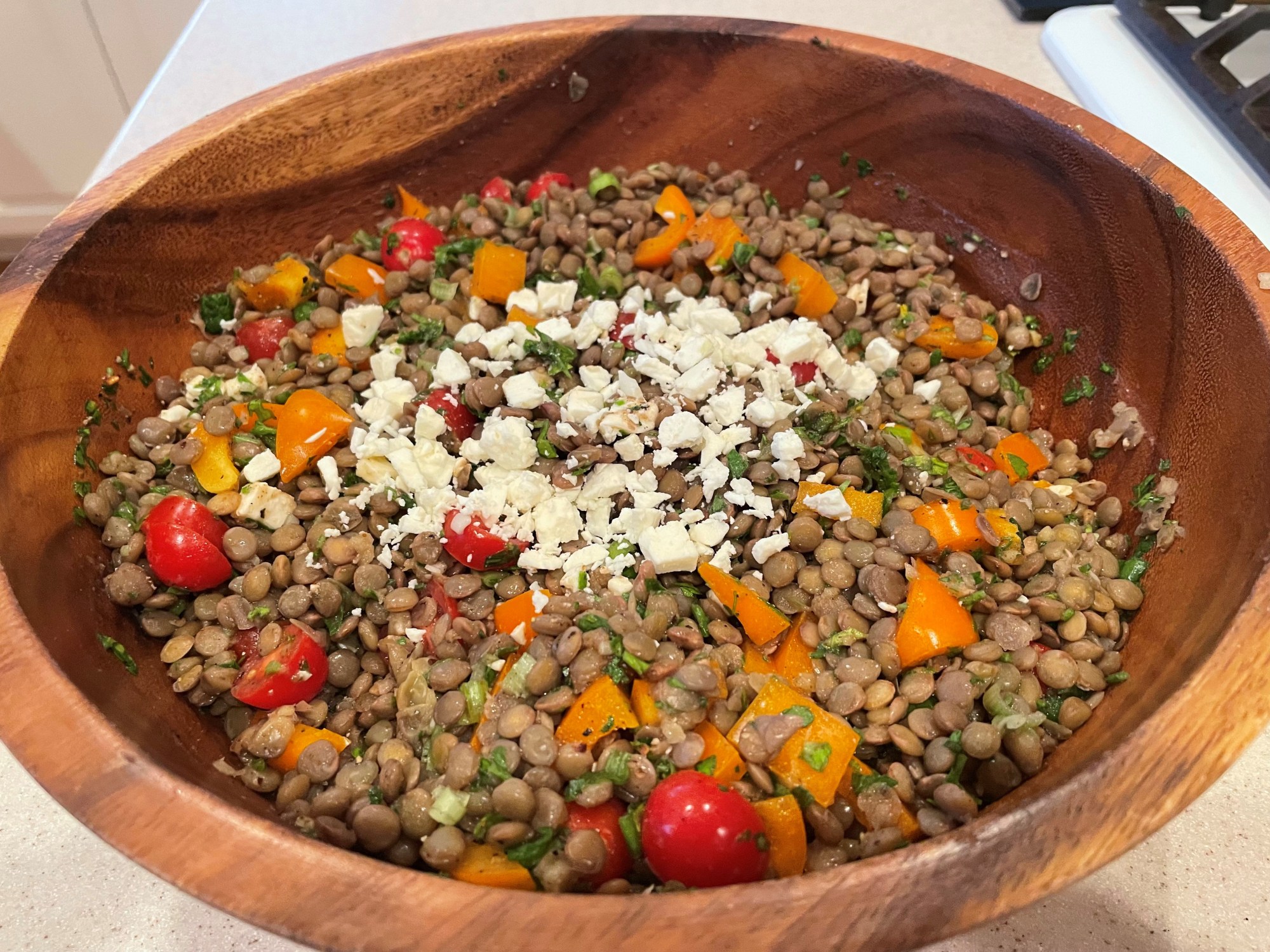 Add tomatoes, pepper, onions and herbs to the lentils and mix carefully