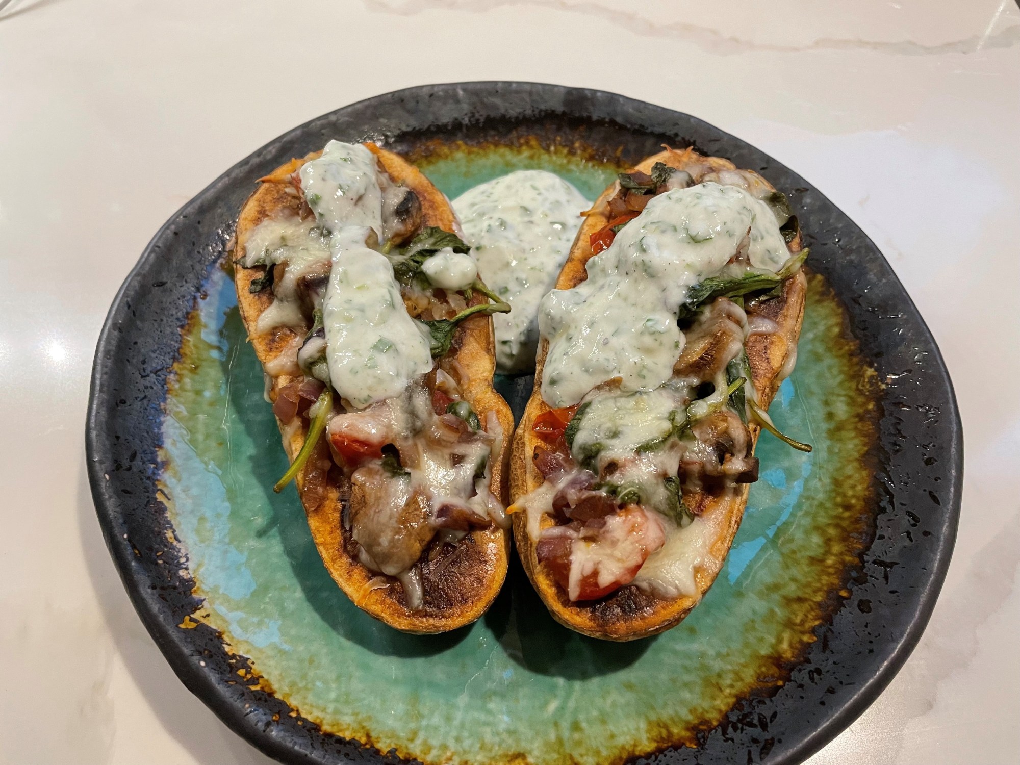 Serve the stuffed baked potatoes and top them with the herb sauce.