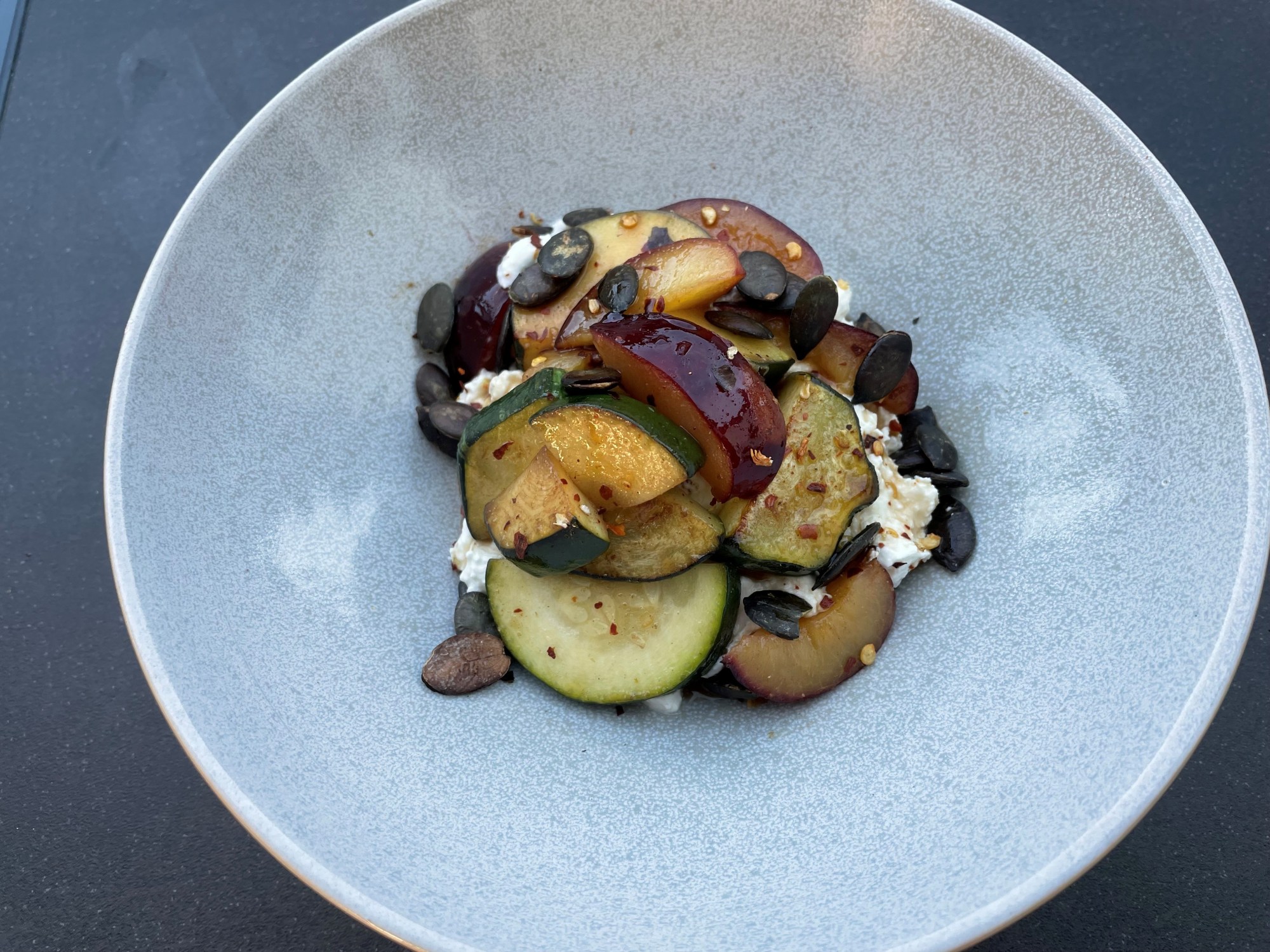 Divide cottage cheese/Greek yogurt between 2-4 bowls (depending on the number of guests) and top it with equal amounts of the zucchini/plum mix. Sprinkle with some chili flakes and pumpkin seeds and drizzle with balsamic vinegar.