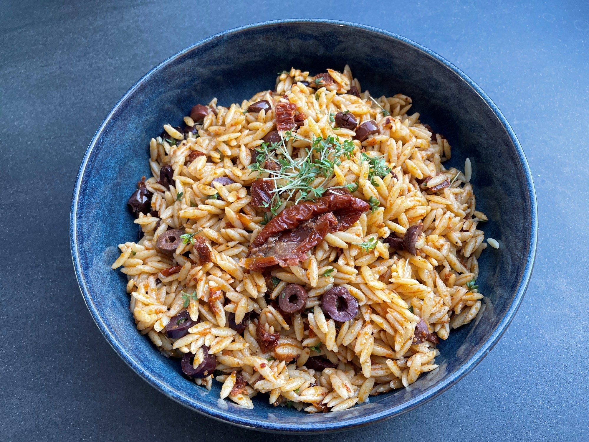 Cook orzo/pasta according to package directions; drain when done and let cool just a bit for about 5 minutes