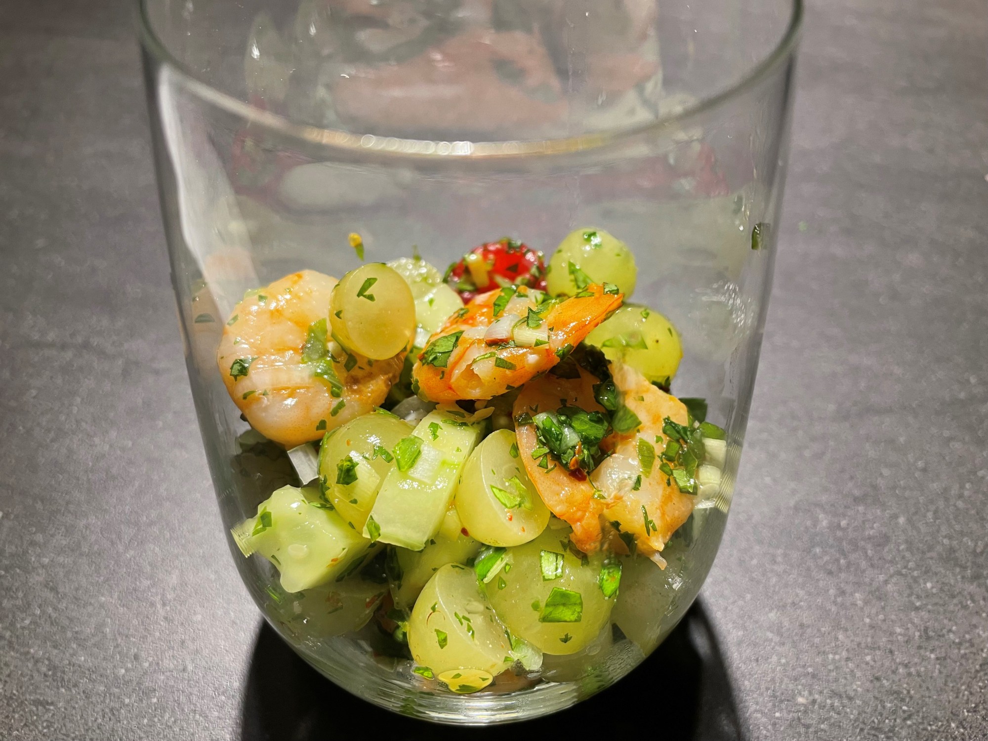 Perfect dish for hot summer days – serve it chilled as an appetizer or as light lunch or dinner. It’s a delightful refreshing and healthy meal combining shrimp with grapes and cucumber.