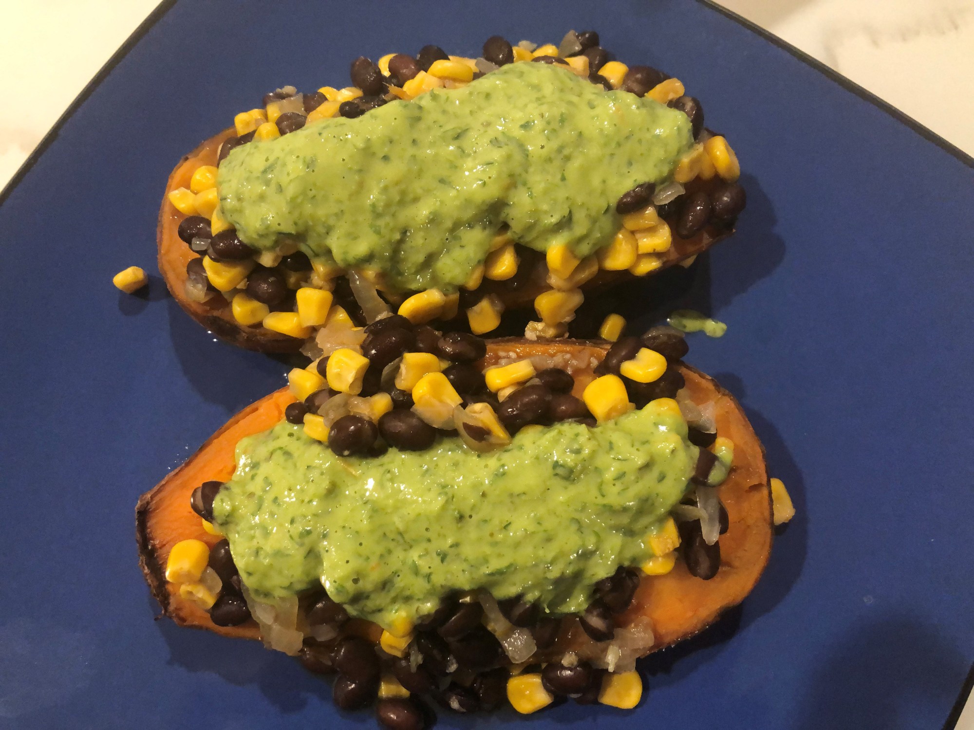 Top each potato half with 3-4 tablespoons of the bean/corn/spinach mix.