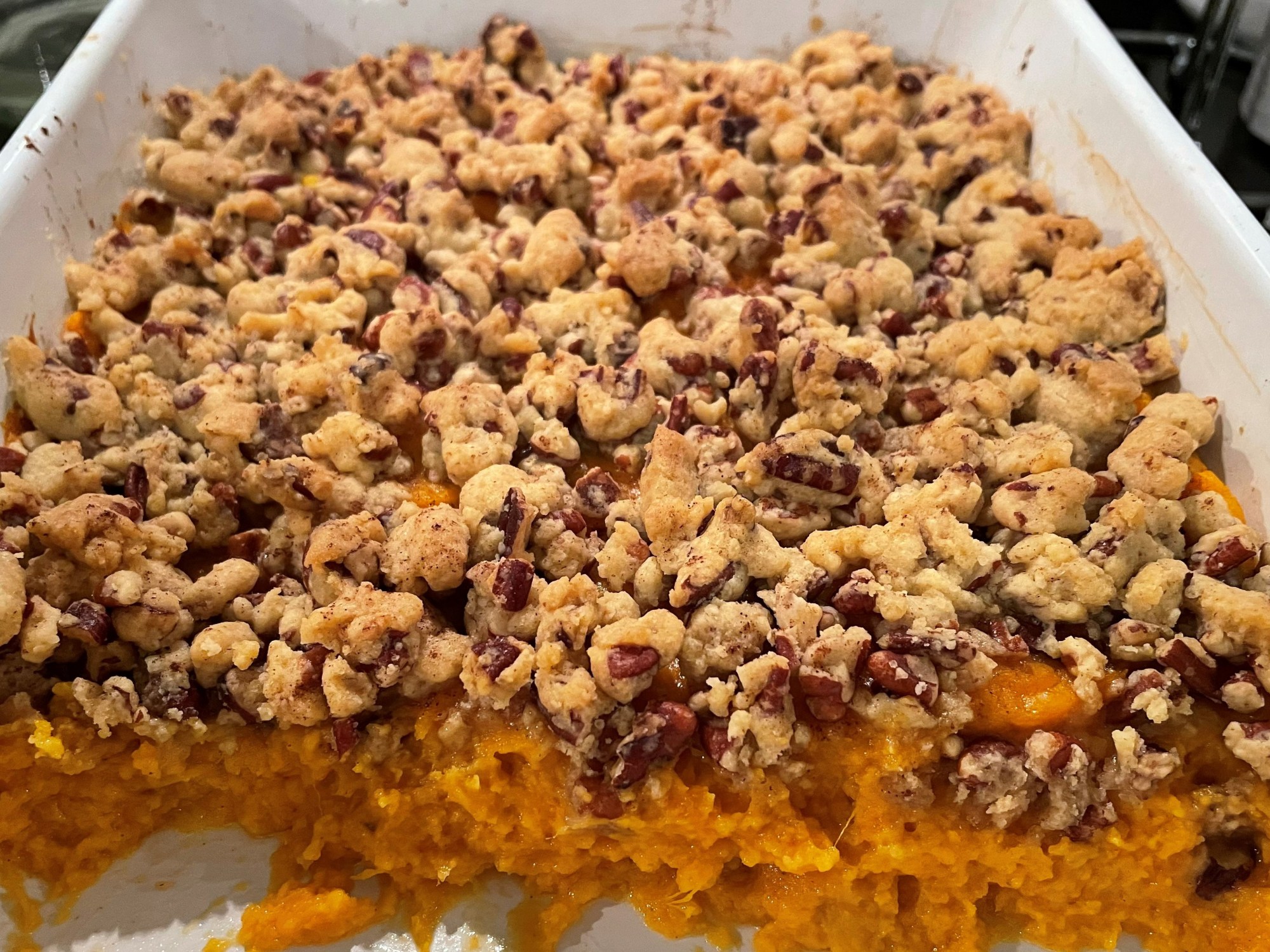 Put butter, mashed sweet potatoes, milk, brown sugar, vanilla, pumpkin spice/cinnamon, salt and eggs in a large bowl and whisk together. Transfer to the prepared baking dish.