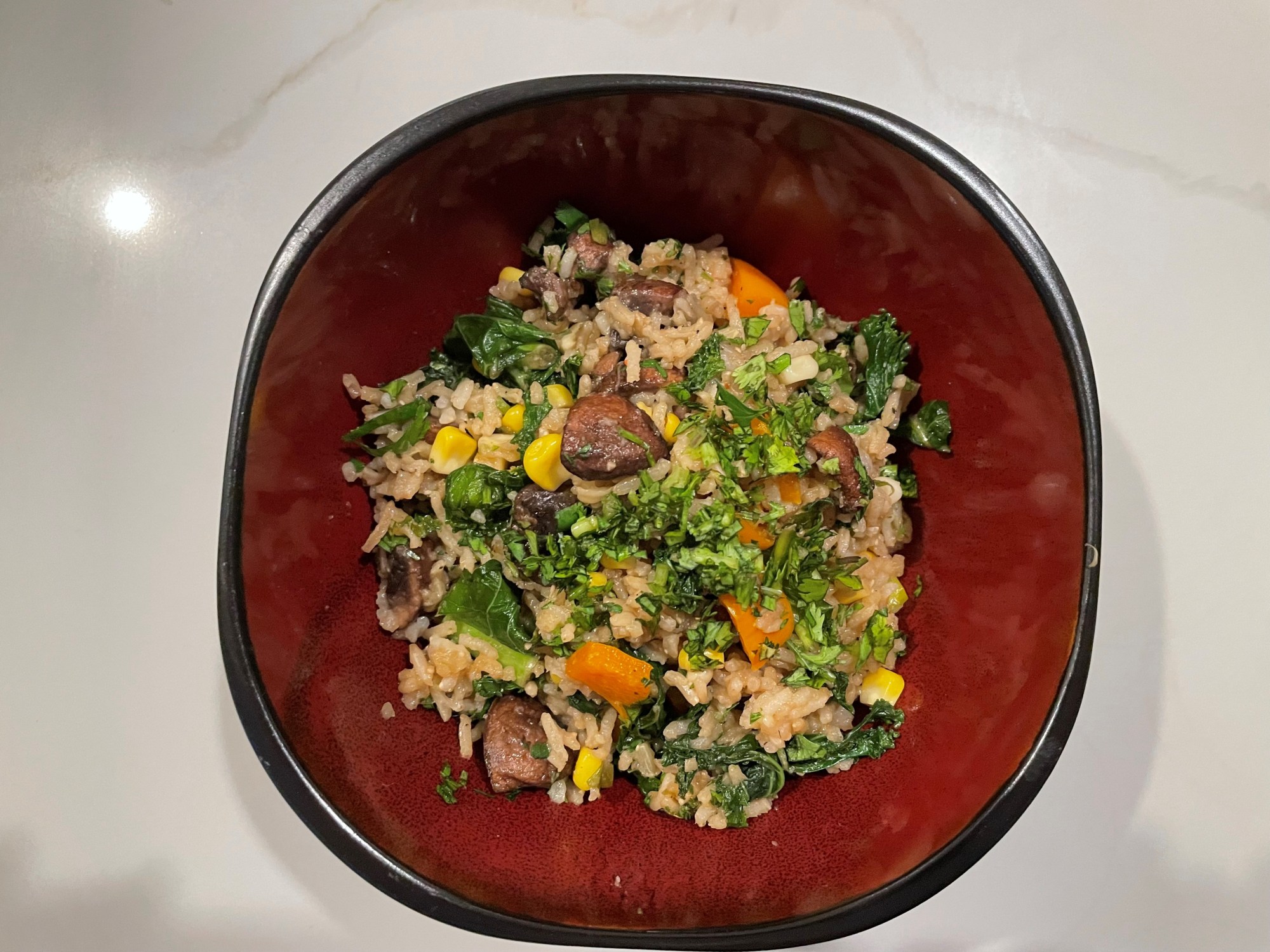 This is a perfect dish to use up leftover rice. Add kale, mushrooms and peppers and turn the rice into a quick and yet nutritious meal. You can substitute with other veggies but keep the kale as it gives the dish some nice crunchiness.
