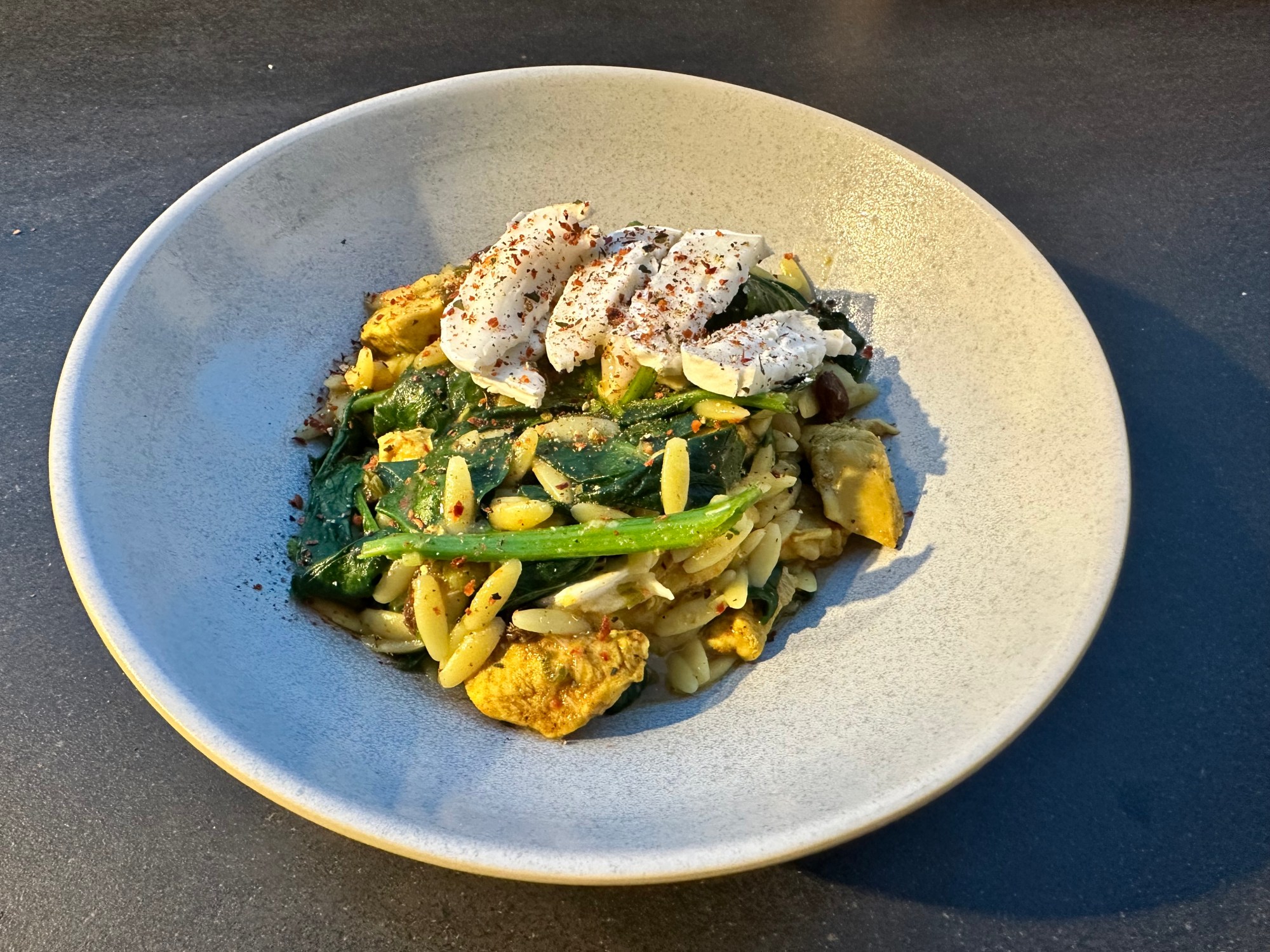 This one-pot dish earns triple points because it is easy, quick and delicious. The mix of fragrant spices, dried fruit and goat cheese combined with orzo, chicken and spinach turns this dish into a flavorful and satisfying lunch or dinner.