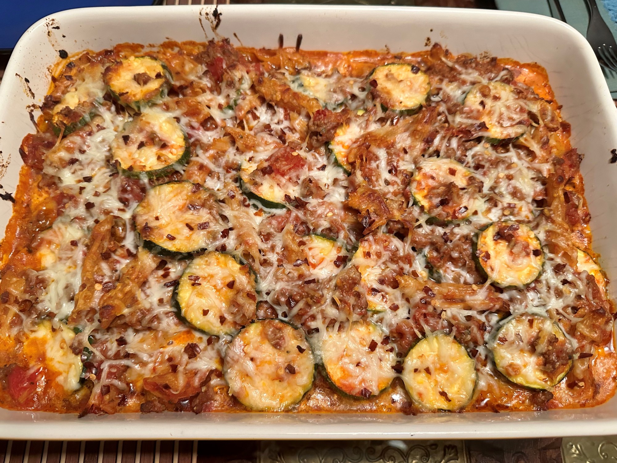 In a large baking dish, place half the zucchini-meat-pasta mixture in an even layer. Top with half the ricotta, and sprinkle with half the mozzarella. Add rest of zucchini in an even layer on top, and top with remaining cheese.