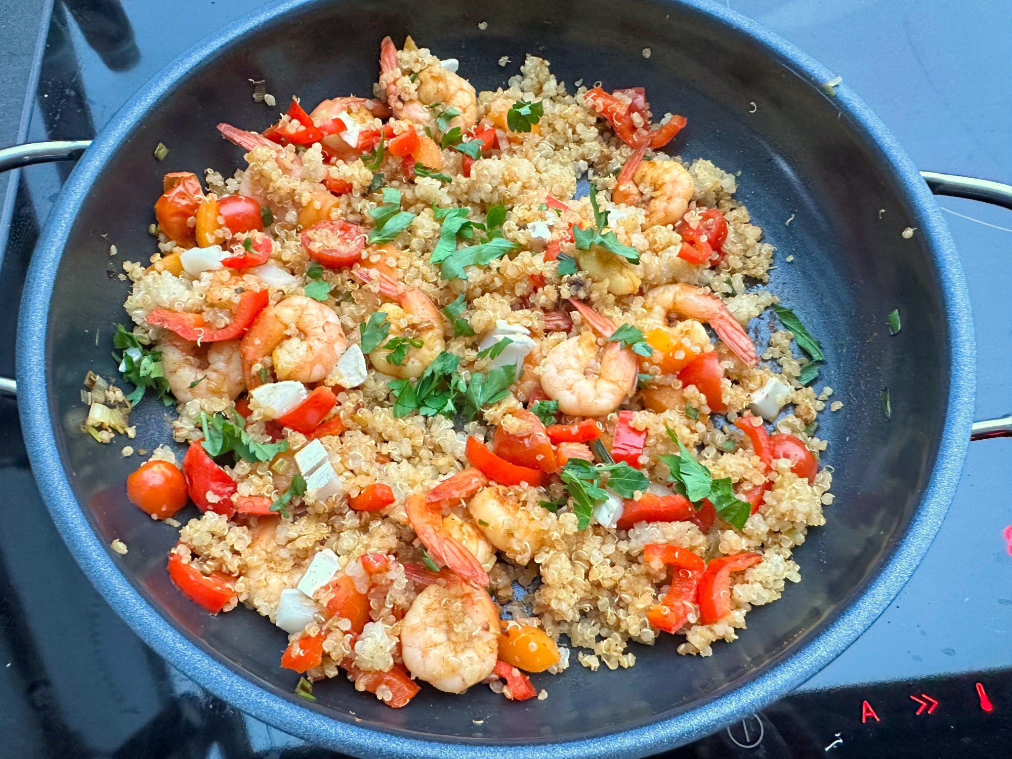 This is an easy and quick one-pot dish combining quinoa, veggies, shrimp and goat cheese with apricots for a sweet punch. The spices give it an oriental flavor and the vinegar adds a sweet-sour fruity taste to round it out. Simply delicious!