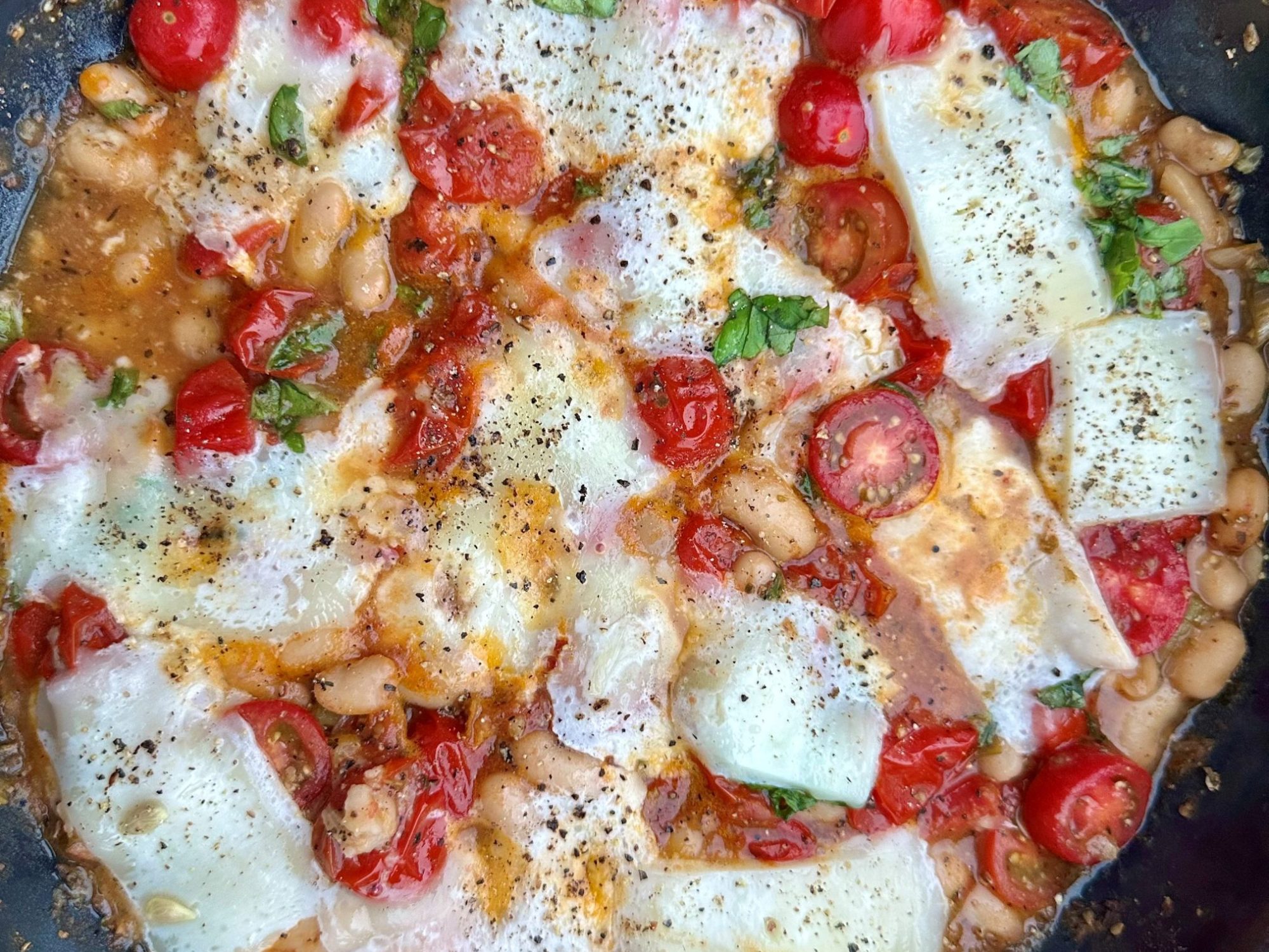 Arrange the feta slices on top of the tomato-bean mixture in the pan. Close lid and let Feta heat up until it starts melting, about 5-6 minutes.
