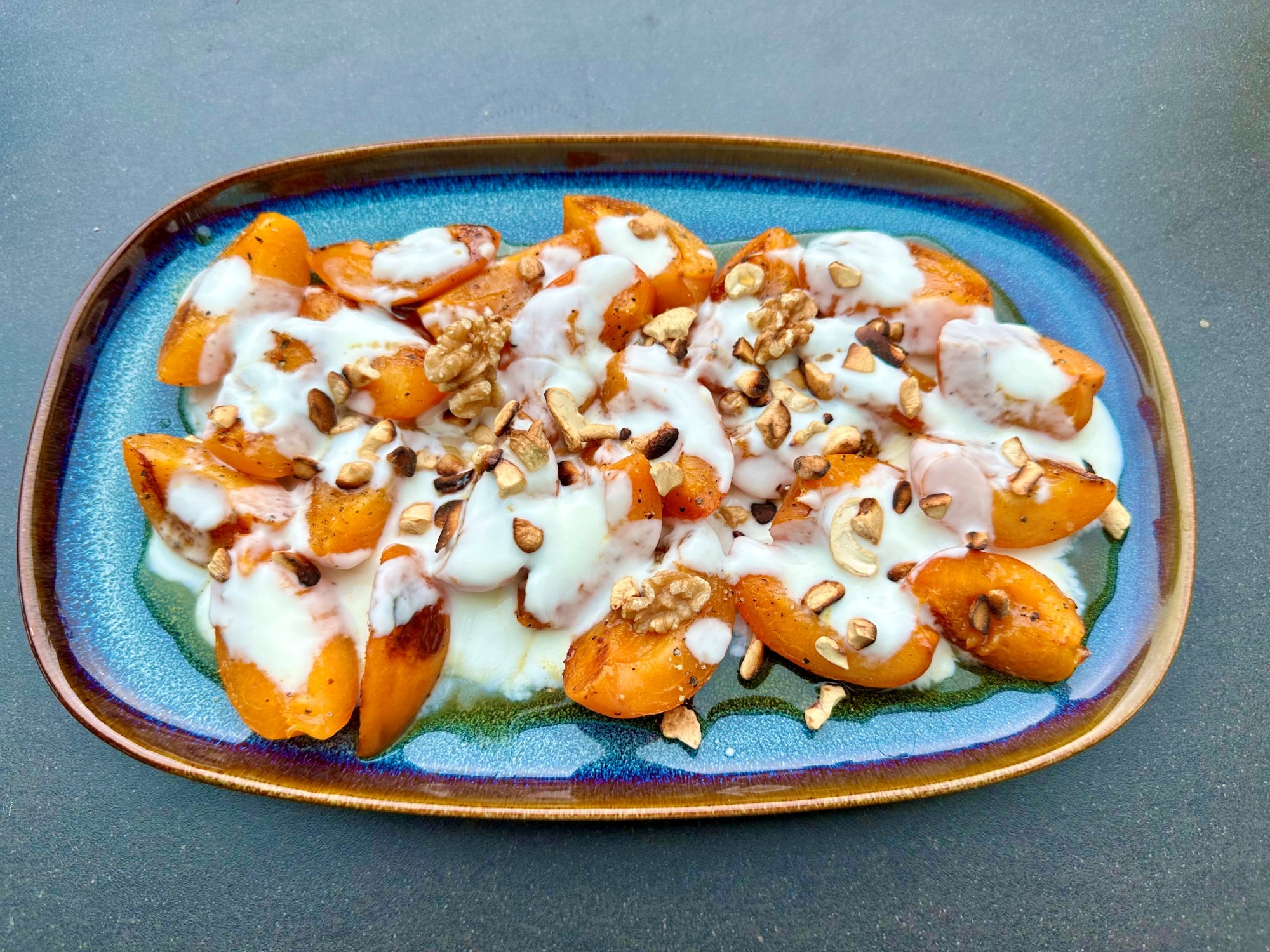 Remove the apricots from pan and spread on a serving platter. Top with yogurt and add 2 more tablespoons of maple syrup on top.