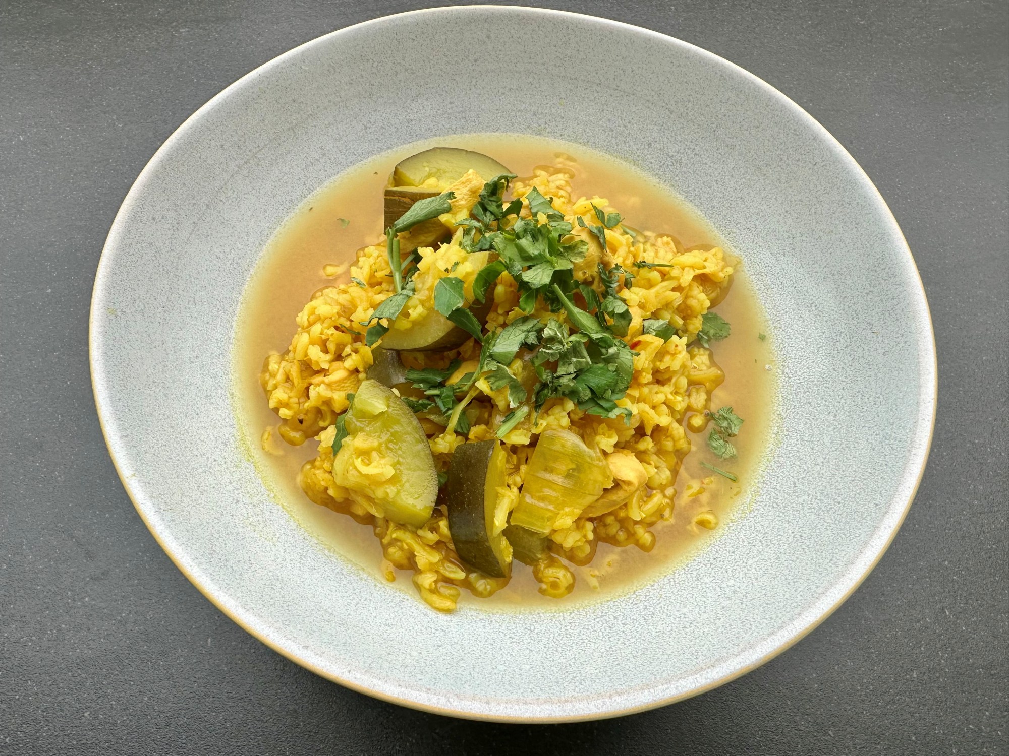 This is the perfect winter soup – hearty, gently spiced and deeply satisfying. Fragrant ginger and garlic are cooked with chicken, rice, zucchini and spices. The recipe can be easily doubled for visiting friends.