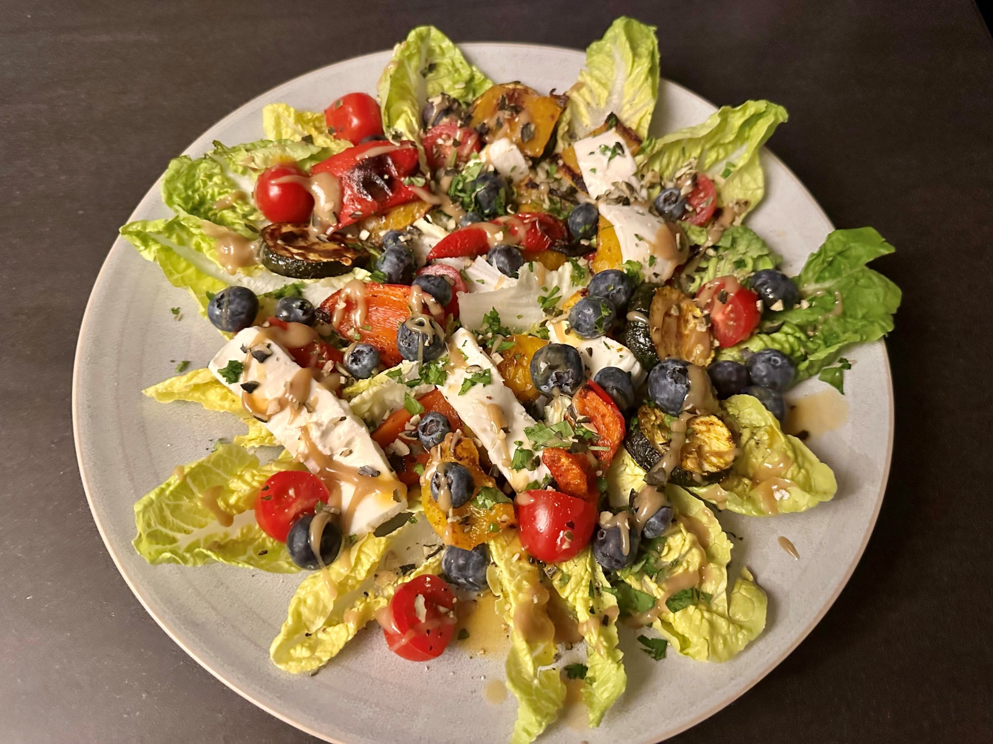 This vibrant salad features roasted zucchini and peppers tossed with spices and baked with feta until soft and flavorful – served over crisp romaine lettuce with a sweet-tangy tahini balsamic dressing.