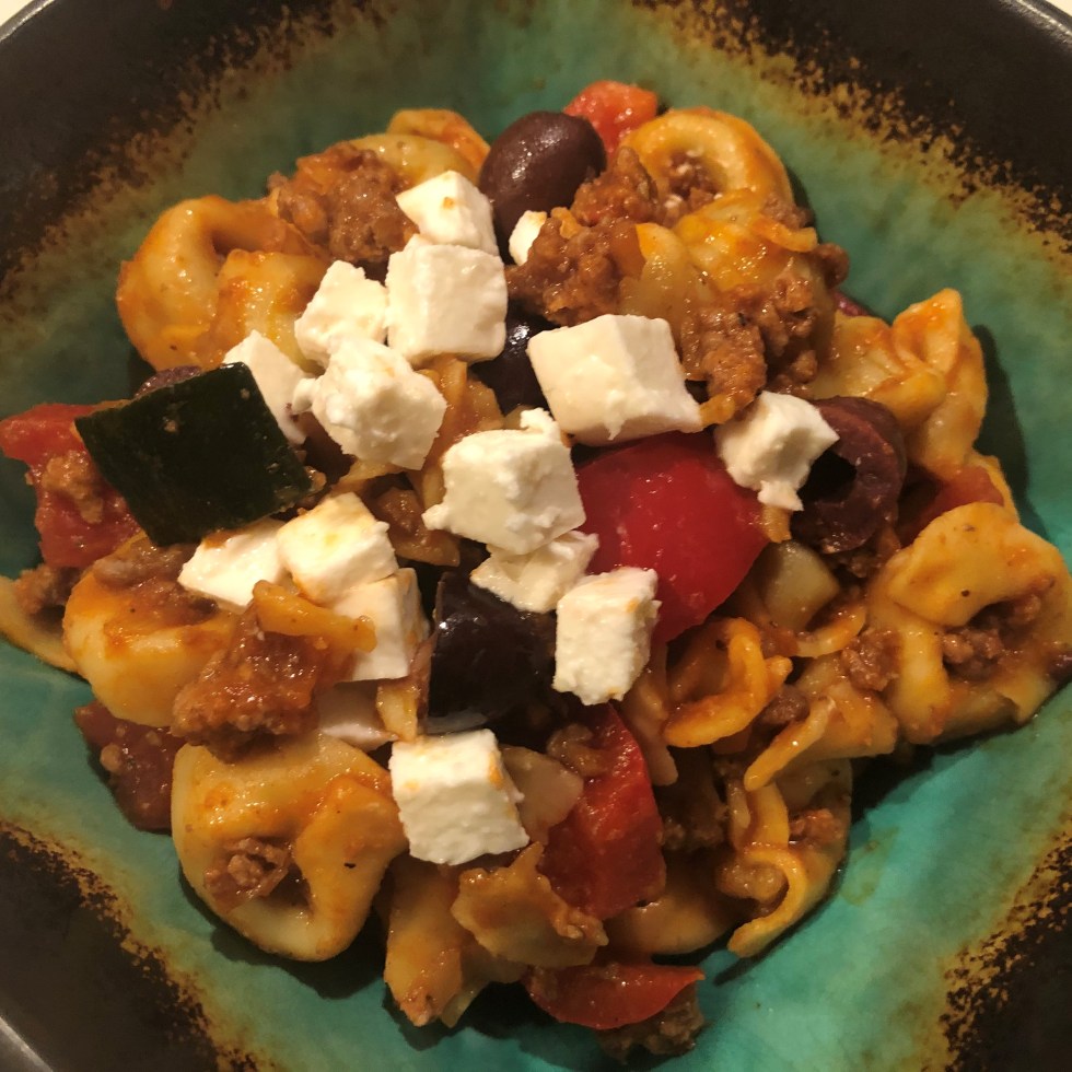 Tortellini with Tomatoes, Beef, Olives and Feta