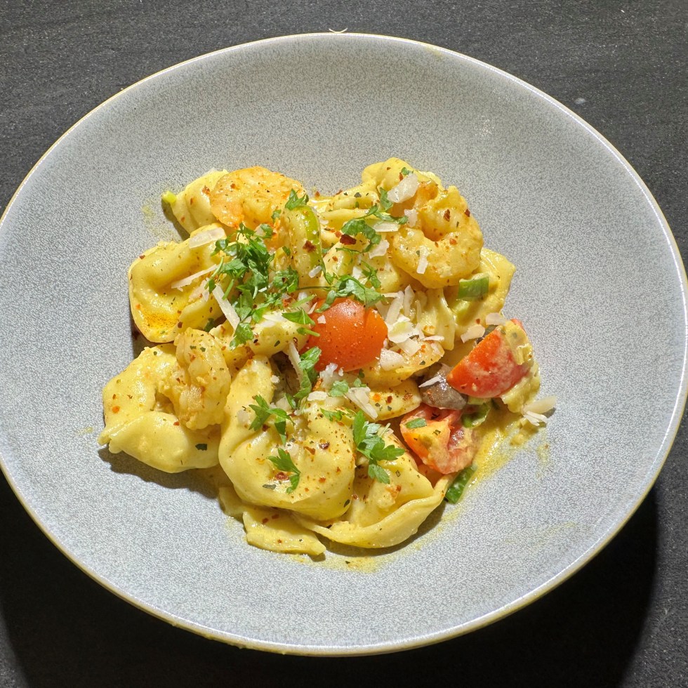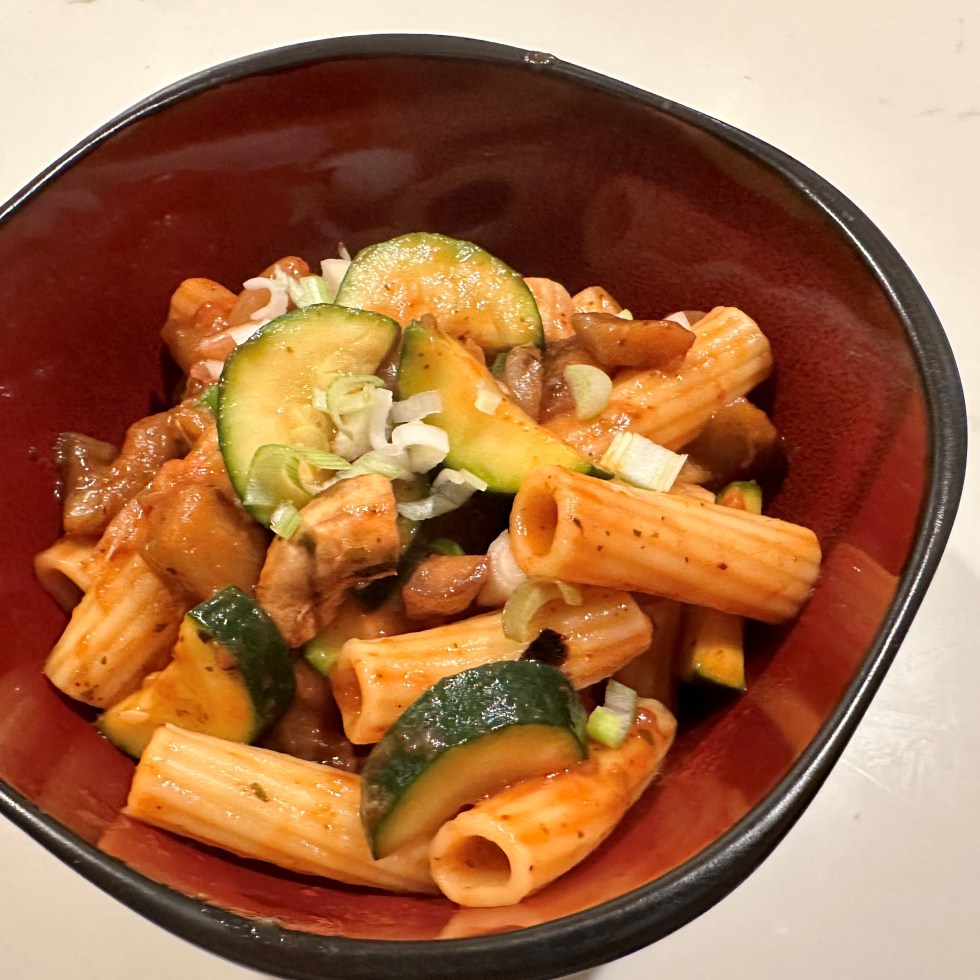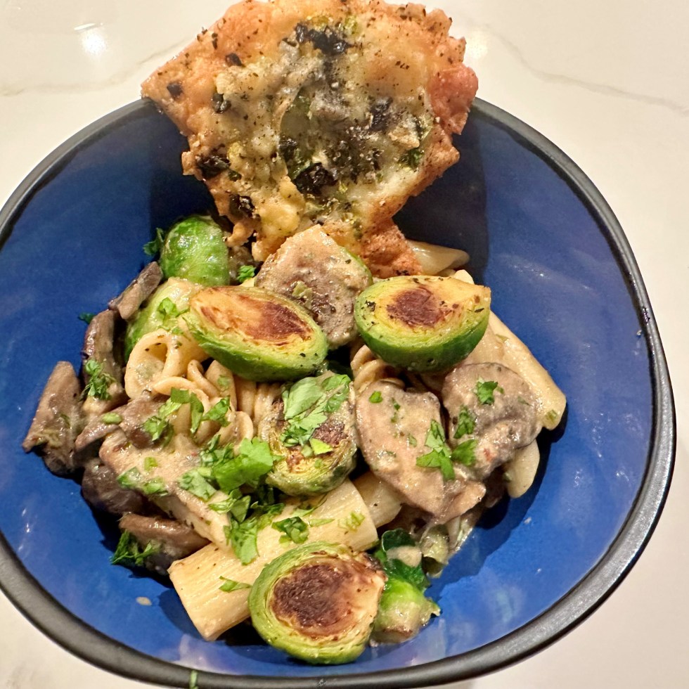 Pasta with Brussel Sprouts, Mushrooms and Cheese Crackers
