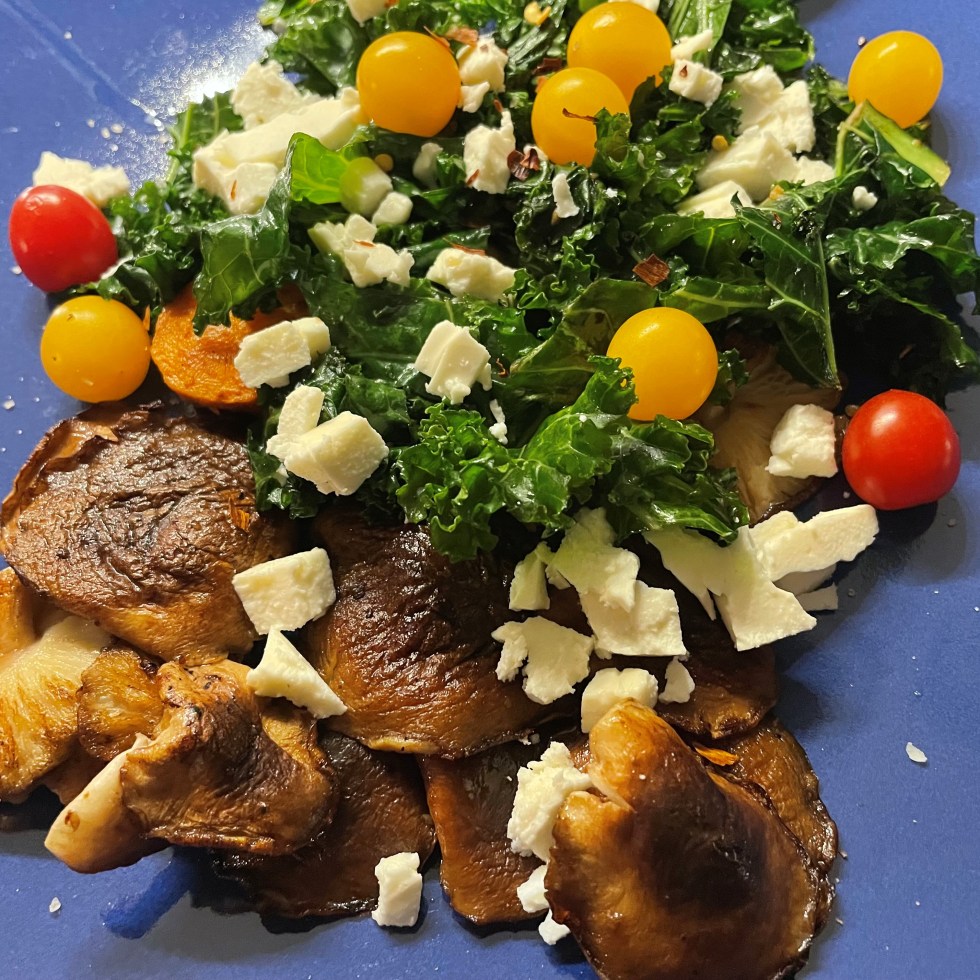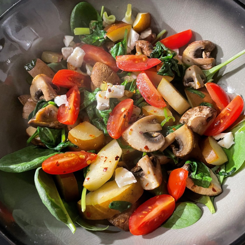 Autumn Salad with Roasted Pears, Mushrooms, Goat Cheese and Spinach